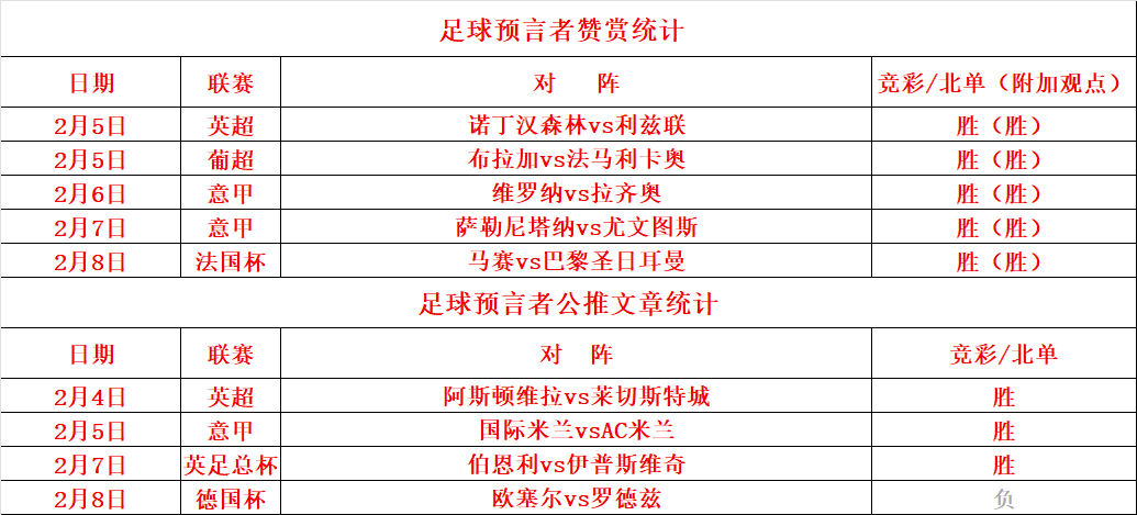 3、有小伙伴们建议笔者在送出比赛方向的同时,能否预测比赛结果,预测比赛结果是有相当的难度,往后的时间里如果是有信心的,笔者会附加上比赛结果,在这感谢大家一直以来的支持。