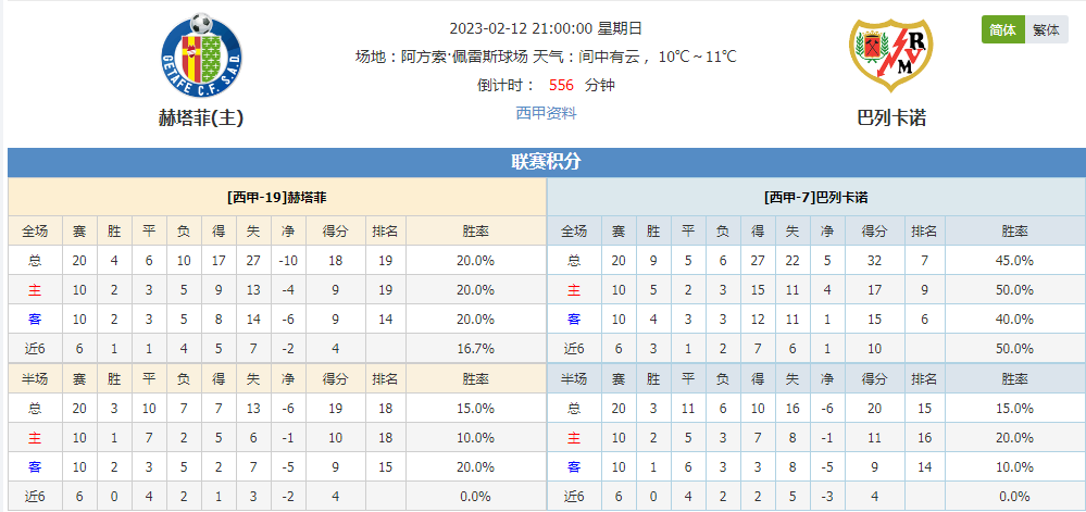 北京时间2023年2月5日20:30,此役是赫塔菲与巴列卡诺今年的第一场对决,赫塔菲近期表现稳定,而且联赛也是挺进欧战区,此役能否乘胜追击将胜利留在主场?而巴列卡诺境况落后不少,此番客访还是难有底气,他们又能否做到反客为主?