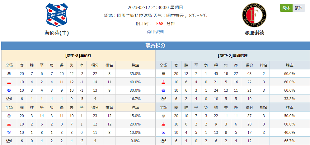 北京时间2月12日21:30,荷甲第21轮赛事海伦芬vs费耶诺德,海伦芬在杯赛取胜止颓,而且目前在联赛也是挤进欧战区,他们能否在此役捍卫主场?费耶诺德境况急转而下,目前被对手超越赶出榜首位置,此番挑战是否已做好准备?