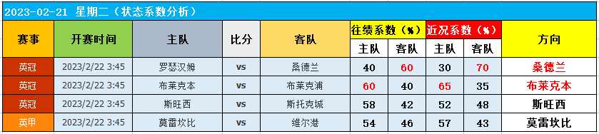 通过对两队的历史成绩、交手成绩及升降级等得出往绩系数;而近况系数则是通过近期(10场左右)成绩分析通过公式计算得出近况系数。
