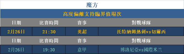 利用「魔方關系」進行支持趨勢預測分析(所有數據均結合中國競彩(主)、亞歐數據作為分析體系),超越臨界數值之上可視為低機率方向,此方式對比賽方向分析有顯著幫助效果。