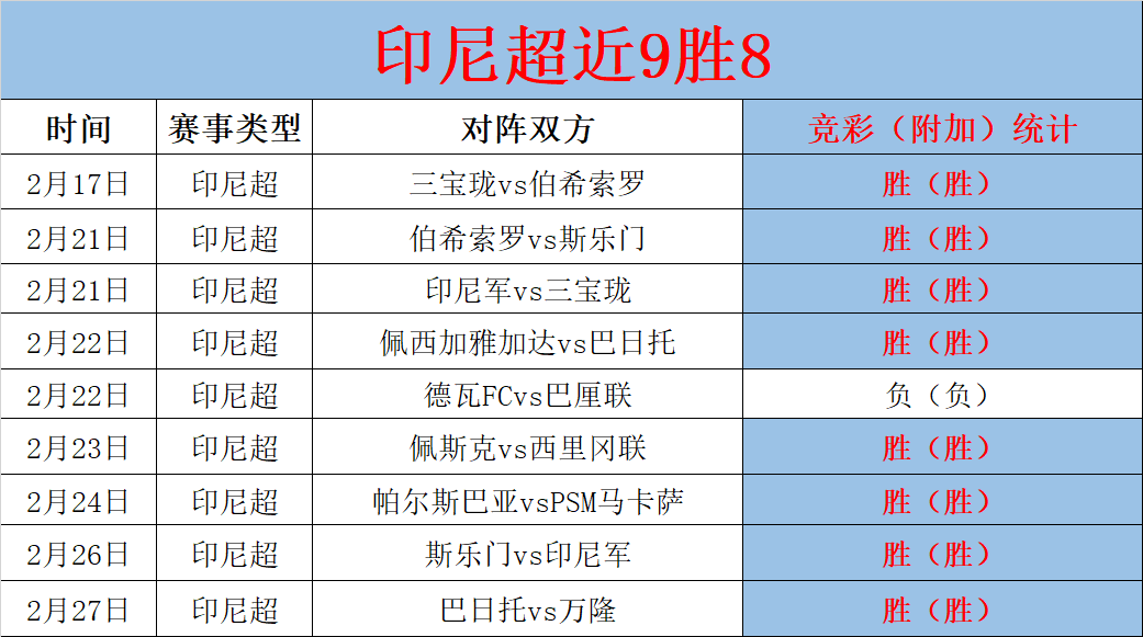 昨天的印尼超再次获胜了,印尼超就是笔者的重点赛事,目前印尼超战绩近9胜8,其余赛事已经获得了5连胜,势不可挡,今天印尼超再接再厉。