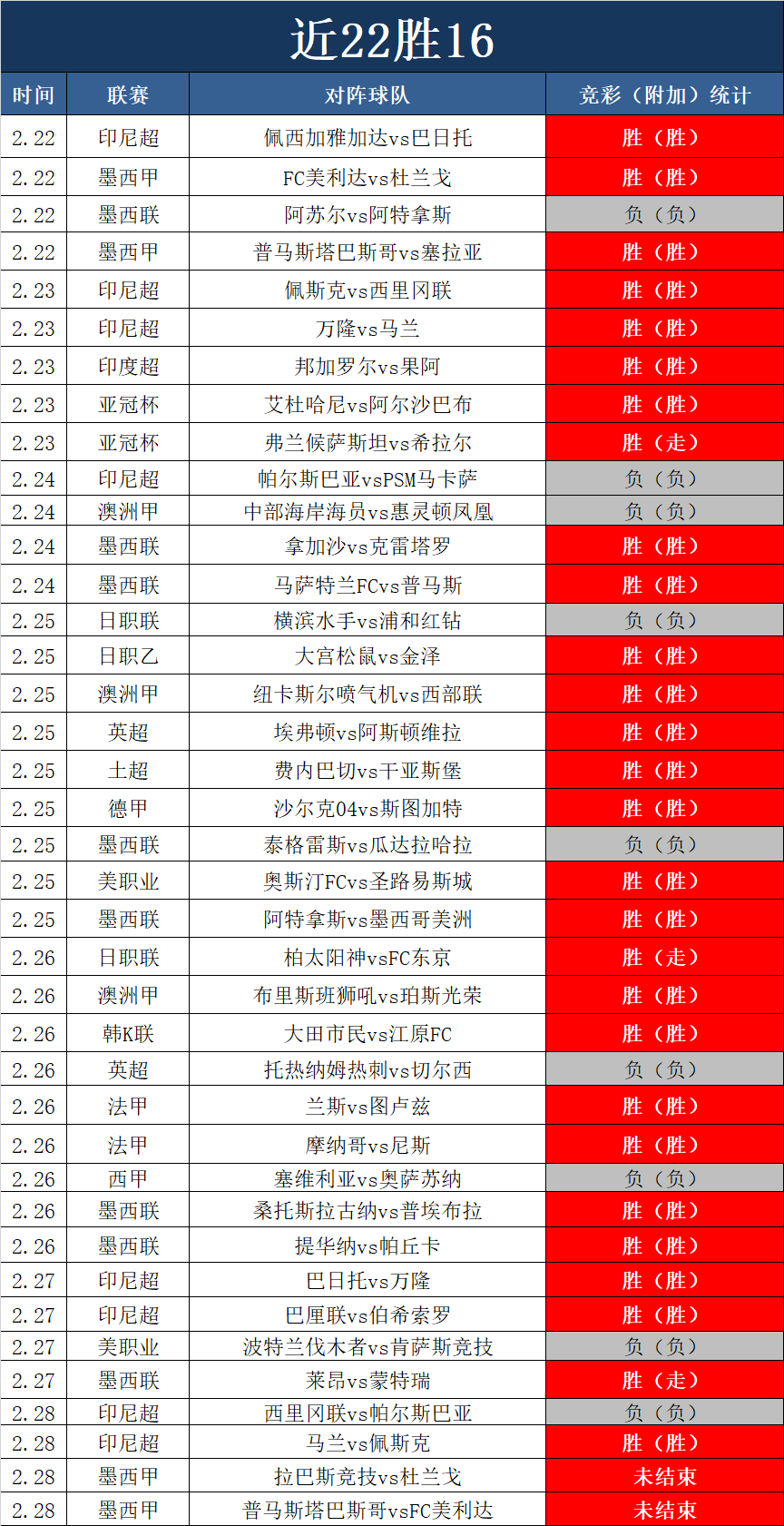精彩分享:昨天状态依然稳定,墨西甲还未结束,印尼超拿下1胜1负,印尼超目前近17胜13,连续多天狂胜,势头正劲,4天创下22胜16的佳绩,笔者已经开启了狂胜模式,韩K2联首秀,敬请期待。