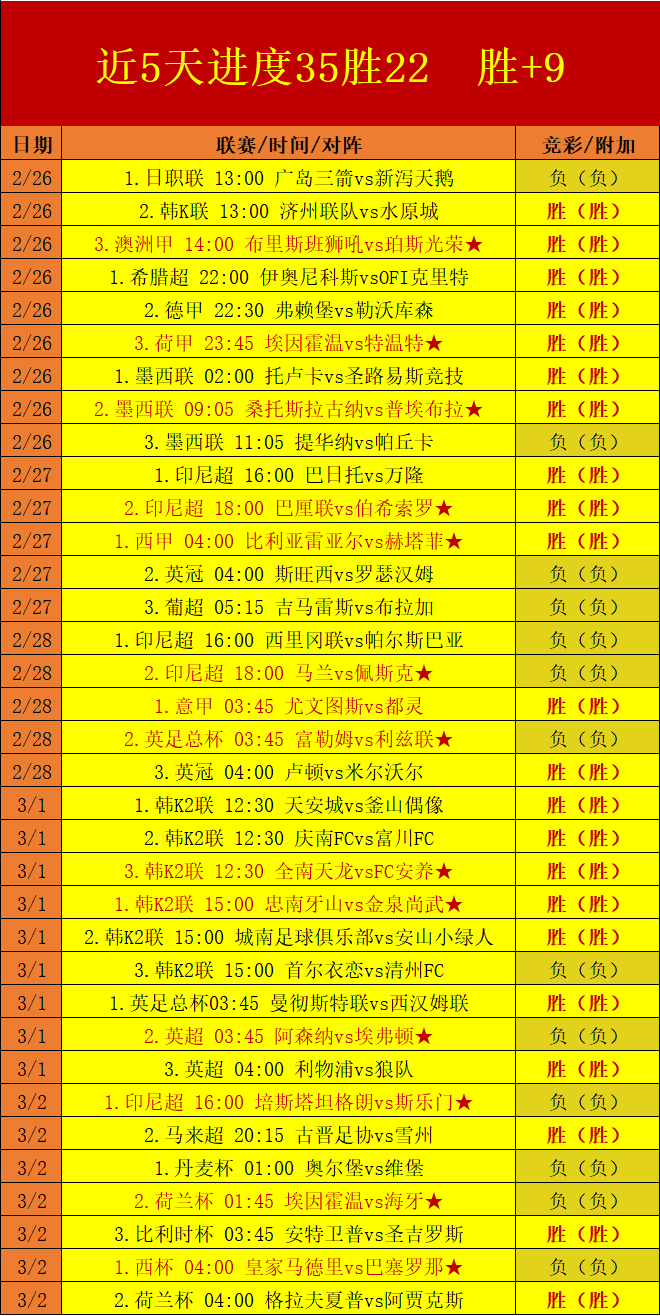 昨日的7场比赛进度遭遇了微弱的阻力,整体表现为单日-1的结果,但本周周中积累丰厚,目前进度在近5天的时间里取得了35胜22收获着胜+9的优秀进程,本日是周末前的倒数一天,即将迎来笔者近一段时间发挥精彩的收官之前,调整好状态和心态再次向着美好的周末冲刺出发!