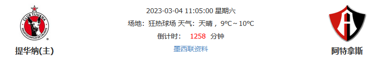 北京时间3月4日11时05分,墨西联的一场焦点比赛,提华纳vs阿特拿斯,提华纳近期主场斩获2连胜,主场表现不俗,此番主场能否延续胜绩?阿特拿斯上轮主场逼平墨西哥美洲,止住连败颓势,士气得到恢复,此番客场能否继续保持?