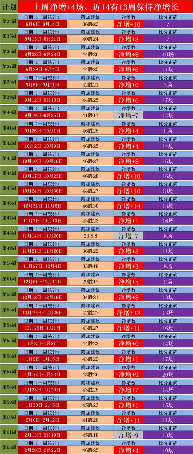 2、上周净增+4,近14周有13周保持净增长,上周预测10场比分正确,持续的保持了高效的稳定。