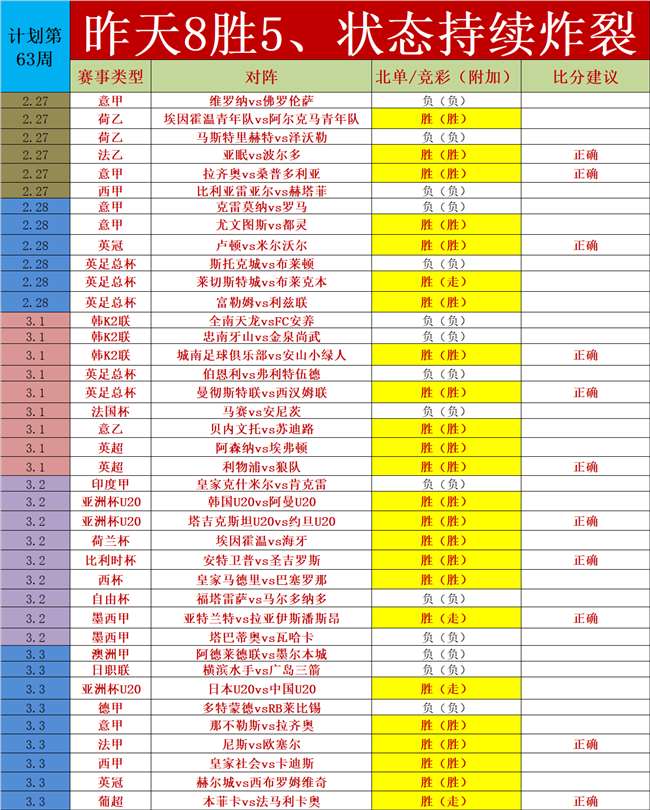 1、推演士计划第63周(走不纳入统计)昨天状态继续炸裂,拿下8胜5的战绩,昨天的晚场欧洲主流联赛大放异彩,拿下6胜5的战绩,欧洲主流、五大联赛从来没让大家失望过,重中之中五大联赛战绩依然保持稳定,特别是葡超本菲卡,在分析中笔者提示了要提防2比0的比分,结果在补时阶段本菲打进1球,结果2比0,笔者也是击中了比分,思路十分清晰,今天我们继续重中之中五大联赛,英超已经是6连胜。