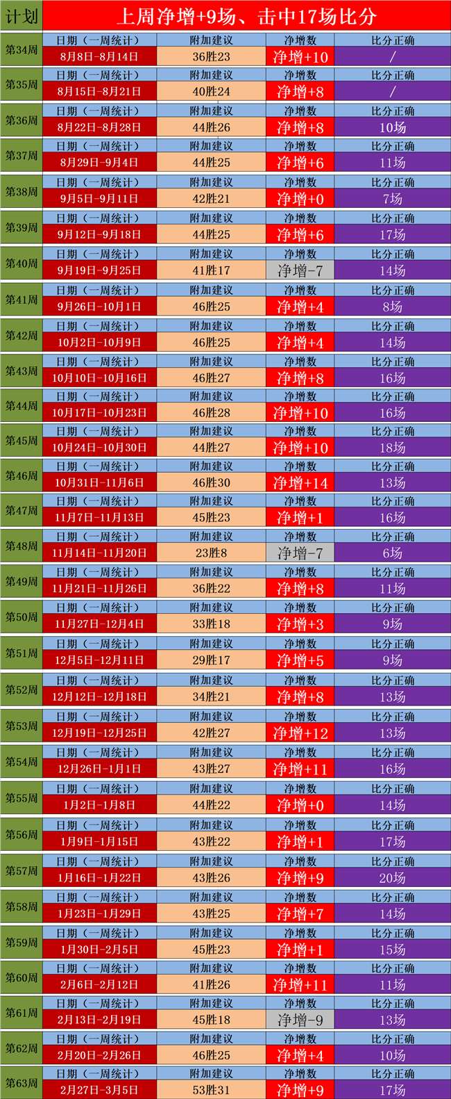 2、上周净增+9,近15周有14周保持净增长,上周预测17场比分正确,持续的保持了高效的稳定。