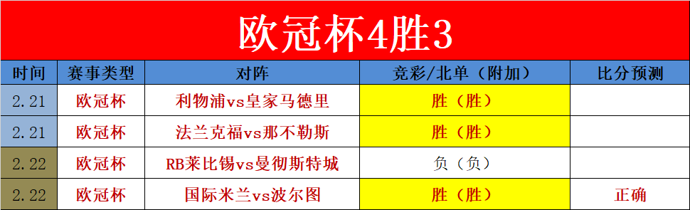 1、推演士计划第64(走不纳入统计)昨天再次竞彩9胜6,状态继续炸裂,继续击中比分,连续两天拿下9胜6的战绩,本周开始就已经是连胜的状态,今天继续乘胜追击,终于等来重点欧冠杯了,欧冠杯16强赛取得4胜3的佳绩。