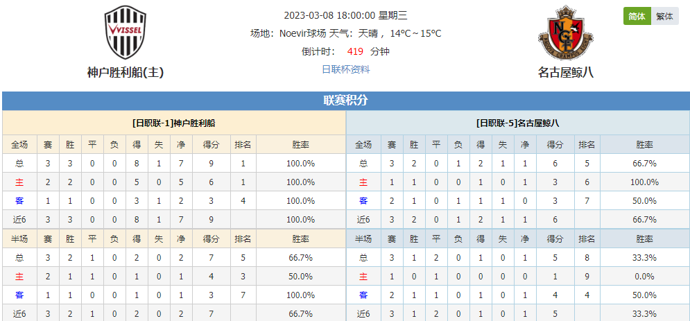 看点:神户胜利船联赛豪取3连胜,此役连续主场作战能否延续胜轨?名古屋鲸八上一场客场0-1不敌鸟栖沙岩,此役客场背靠背作战能否全身而退?