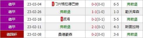 而在上轮德甲联赛当中,弗赖堡则在客场以0-0的比分与门兴互交白卷各取一分,球队在过去的5场各项赛事取得3胜2平保持着不败的态势,期间球队在后防线上仅丢了2球,包括在期间3次作客出征中均能够做到零封对手的表现,可见球队近期整体状态不容小觑呀!