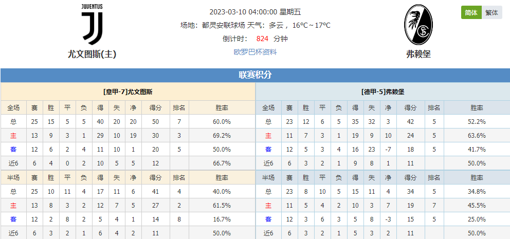 看点:尤文图斯上一场比赛客场0-1不敌罗马,此役欧罗巴杯赛事状态能否提升?弗赖堡近期连续5场比赛不败,此役作客面对尤文图斯能否延续不败走势?