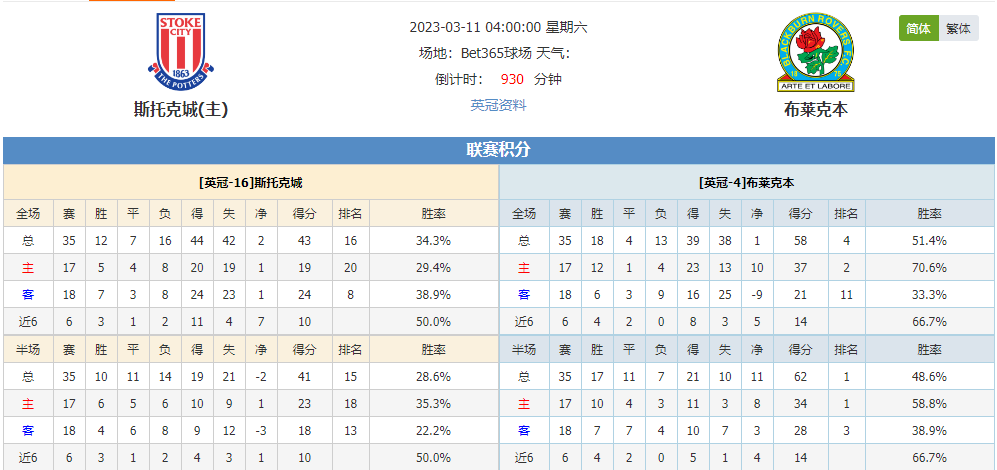 布莱克本在英冠本赛季的35轮比赛成绩为18胜4平13负,球队也是领先对手不少,对于布莱克本来说,这个赛季的竞争表现还算乐观,能有展望升级席位的可能。目前总积分为58分,排在联赛的第4名。联赛总进球为39球,进攻端相比略有逊色,总失球为38球,他们的防线表现反而比对手出色。近5场赛事成绩为5胜0平0负,总进球为8球,场均打进2球,球队的进攻端变得火热。总失球达到了2球,场均失球0.4个,防守端固若金汤,取得胜绩之余还能保持零封。布莱克本上一役对战谢菲尔德联队,终以1:0战胜对手,一举拿下5连胜的佳绩。布莱克本与斯托克城近10场交手的成绩是4胜2平4负,球队往绩不占优势。而双方上一次交手是以布莱克本0:1主场战败于斯托克城之手,此役主客交换,布莱克本是否有能力为上战落败完成复仇?