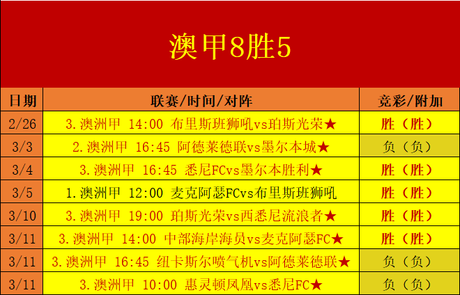 昨日已完成赛事的9场比赛再次获得了6场胜利的增长表现,周末的两天时间里保持了稳定的增长表现,再次收获了一个完美的周末收官增长成绩单,澳洲甲周末两天时间不胜不负表现平稳,继续携手信心板块开启新一周的比赛冲击!