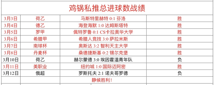 周日私推赞赏1场走了,没能胜利有些可惜!总进球数1场小负,总进球数近9胜7,状态不错!后续还需加油!鸡锅的私推多半都是小联赛,这些海外小联赛信息方向非常准确,经过近几年的耕耘,海外信息渠.道已经打通,到了丰收的时候了!