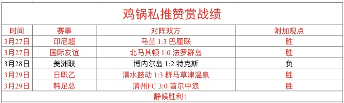 周三私推赞赏2场,完美全胜,很舒服,赞赏近5胜4!总进球数1场没有打出,3连胜被终结了!今天全胜搞起来!