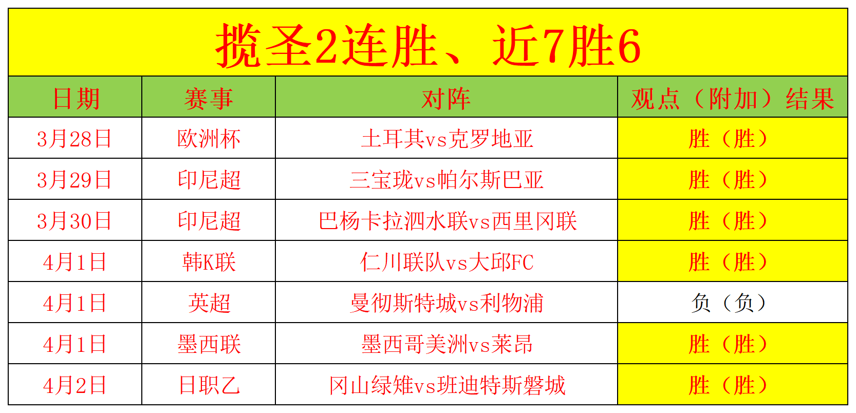 昨天3场比赛2胜1负,另早场的日职乙也准确打出,近期整体成绩7胜6,目前2连胜,笔者状态依旧强势,接下来继续重点出击墨西联,笔者对墨西联有自己独到的见解,墨西联近期的成绩也证明了笔者的分析能力到位,墨西联目前5连胜,今天冲6连胜。足球比赛是追求长期的稳定,长期的关注才能得益,一时的下滑并不意味着失败,大家不要因为一时的下滑而放弃关注,笔者会努力挖掘更精准的赛事分享给大家,感谢大家的支持。
