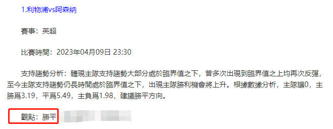 【解鎖內容為以上賽事支持趨勢預測圖展示,以及根據分析預測圖進行相對低機率方向觀點判斷。解鎖內容僅代表個人知識領域觀點,與本網站無關】