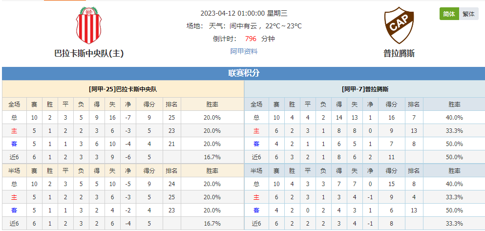 北京时间2023年4月12日01:00,此役是巴拉卡斯中秧队与普拉腾斯今年的第一场对决,巴拉卡斯中秧队毫无翻身的迹象,而且联赛也是在倒数挣扎,此役能否触底反弹将积分留在主场?而普拉腾斯境况领先不多,此番客访还是不失底气,他们又能否做到反客为主?