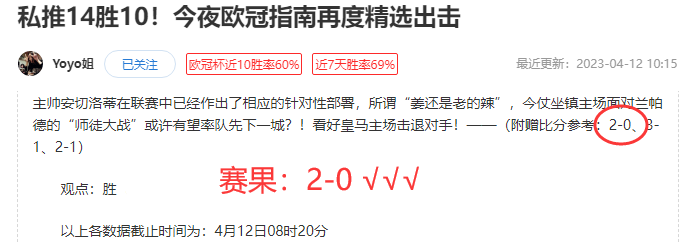 昨天三箭齐发!首先私推阿甲圣洛伦索1-0小胜小保家,私推近15胜11走1表现尚可!而超级重点方案和公推的欧冠双双拿下状态极佳!——今天核心赛事已确认(公推暂停,打赏昨天文章即可获取),多一份参考离喜悦再近一步,Yoyo将继续率粉粉们继续前行~