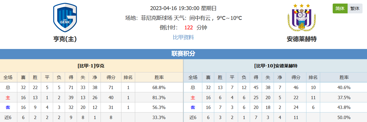 亨克在上场比甲的比赛中坐镇主场迎战排名第六的标准列日,他们在赛场上占据主动,锋线球员创造了19脚射门全部却未能取得进球,反而是被主队两度抓住机会破门以2:0作客失败结束,他们近10场比赛表现并不如意仅取得3胜4平3负的战绩,整体士气和状态在比较低迷的位置上。目前在比甲联赛中已赛32场取得22胜5平5负的优异战绩,不过他们在近5个主场作战表现出较起伏的状态,取得3胜1平1负的战绩,主场的能力须持保留态度。