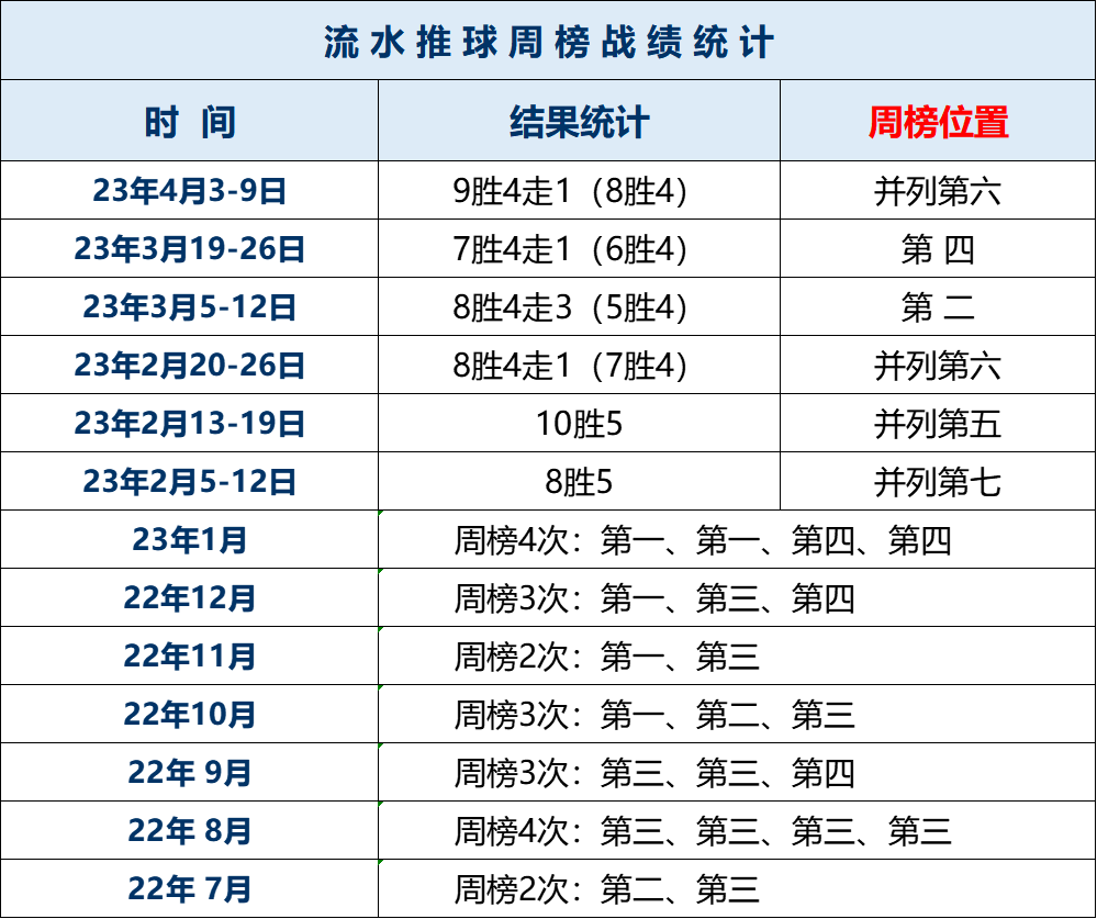 22年7月18-9月18,连续8周均入列周榜前四,其中7次前三;