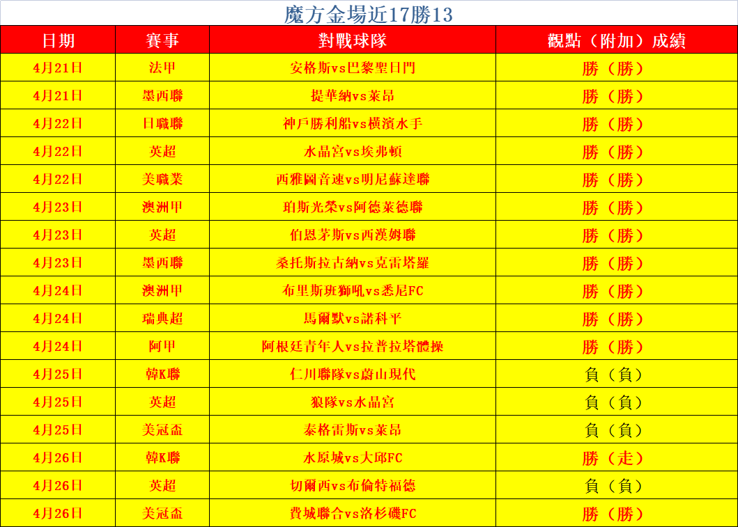 魔方昨天勝負各半,金場成績穩定,近17勝13!接下來魔方將會不斷努力務求精益求精!今日對五大聯賽以及美賽進行深研。