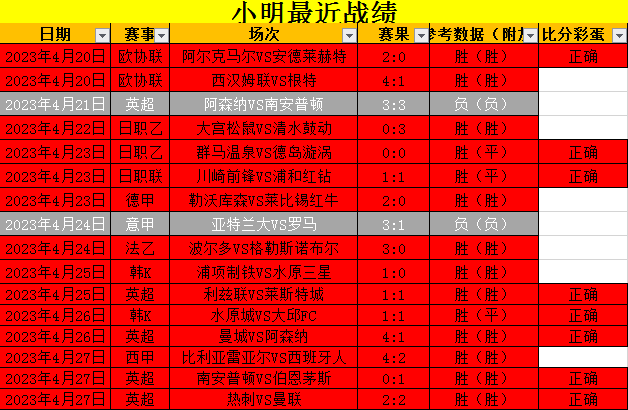 昨天3场比赛全胜!并且拿下2场合计2630%的比分!小明连续3天拿下超高数据的比分,成功让朋友们加餐!近期取得16场比赛胜14的佳绩,小明两周时间内达成15连胜成就!是值得大家长期关注的。第一场:比利亚雷亚尔4:2西班牙人,本场比赛潜水艇主场强势,西班牙人近期客场乏力,防守不稳固,很难客场全身而退。果然西班牙人客场丢掉4个球,我们选择主队成功拿下。第二场:南安普顿0:1伯恩茅斯,主队几乎铁定降级,本场主场也没啥优势。客队近期客场表现有所回升,大好的取分机会不会放过。伯恩茅斯客场1:0成功带走比赛,小明给到0:1的1530%比分成功拿下!第三场:热刺2:2曼联,曼联近期体能消耗过大,这场比赛只踢了45分钟好球,下半场几乎被压着打。热刺虽然开出0:2落后,但是依靠下半场奋起直追,两队2:2战平,小明给到热刺方面成功拿下半个数据,并且再次收获1100%比分!近期小明比分命中率超高,有喜欢研究比分的朋友们欢迎一起解锁探讨!希望今天也能够分析正确,给大家带去理想的赛果。