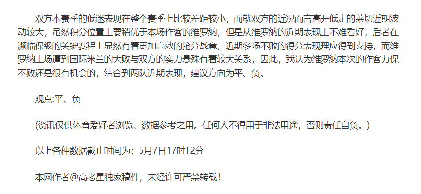 大家好!我是高老星。拥有十年体育数据分析征战生涯,积累过千场分析的标准案例,擅长从数据变化中寻找破绽,擅长联赛:中日韩澳+五大联赛,分析风格:从基本面探底结合内部数据变化追踪,权衡主客战绩分配偏重要点,如异常数据的实时变化和球队近况的组合拳分析,期待与你分享!