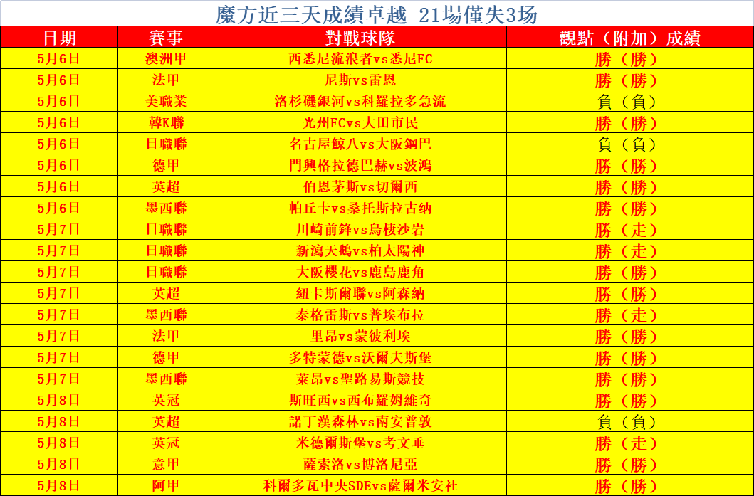 魔方昨日繼續保持正向,完場賽事5勝4,近3天整體成績21場賽事僅失3場!金場成績持續穩定高效,近50勝37,正向+24!接下來魔方將會不斷努力務求精益求精!今日對歐賽以及美賽進行深研。