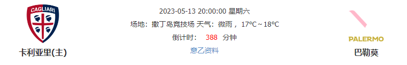北京时间05月13日20时00分,意大利乙组联赛迎来37轮赛事第6场较量:由卡利亚里坐阵撒丁岛竞技场迎战巴勒莫,首回合客场落败的卡利亚里,正以两场连胜宣示正值状态,主场能轻松复仇吗?