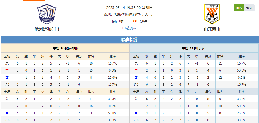 北京时间2023年5月14日19:35,此役是沧州雄狮与山东泰山今年的第一场对决,沧州雄狮鲜有胜绩,他们能否在此役及时完成调整?而山东泰山开局同样不佳,此番客访未失底气,他们又能否做到反客为主?