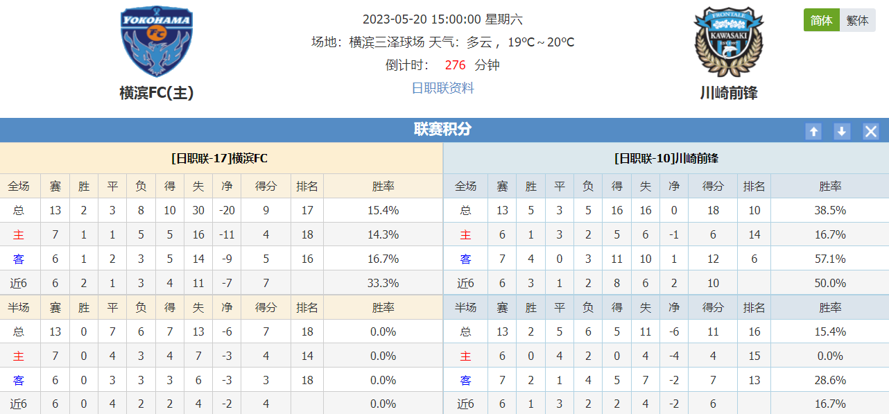 横滨FC是日职联的升班马,球队本赛季唯一目标就是保级,横滨FC新赛季13场比赛过后2胜3平8负积9分排名日职联第17位,领先身后降级区的大阪钢巴仅2分,球队急需要积分追赶,此役战意十足!横滨FC近期表现有明显提升,球队近3场比赛取得2胜1负的出色表现!上一场比赛对阵柏太阳神1-0战胜对手,横滨FC取胜的2场比赛当中球队都零封对手,球队后防表现出色,此役主场作战值得期待!