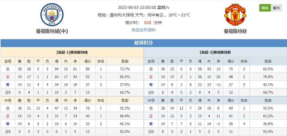 北京时间2023年6月3日22:00,此役是曼彻斯特联与曼彻斯特城今年的第二场对决,曼彻斯特城依旧势如破竹,如今将为三冠王而努力,此役能否拿下胜绩再夺荣誉?而曼彻斯特联境况回升,此番客访定然不失抢胜战意,他们又能否拿下同城对手?