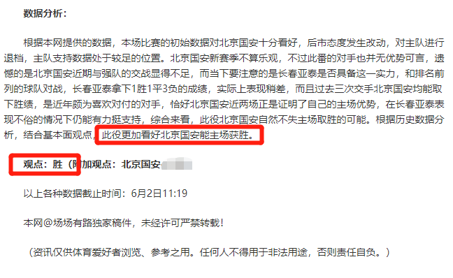 本人作者名场场有路,顾名思义,就是每场进行分析的比赛都是思路,按部就班进行。多年在各大权威外界进行比赛数据归类统计,由于对体育比赛数据有长期的统计经验,根据其规律,研发出一套对规律延伸出来的分析思路,有效率经过长期考验,令人满意。