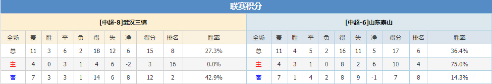 反观对手这边,传统豪门山东泰山在上个赛季仅以净盛球的劣势不敌本轮的对手武汉三镇,与中超联赛冠军擦肩而过。而在本赛季11轮赛事战罢,韩国名帅崔康熙带领山东泰山拿下了4胜5平2负的战绩积得17分排名联赛第6,与身前的几名对手差距不算太大,此役取胜欲望相当强烈。但需留意,山东泰山在本赛季作客出征的7轮联赛中只取得1胜4平2负的表现,异地作赛能力相比主场逊色不少,今仗出击能否重拾状态?