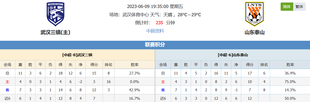 北京时间6月09日19:35,中超2023赛季第12轮比赛,武汉三镇vs山东泰山,两支上赛季争夺冠军的对手在本赛季第一次相遇,目前他们的境况均不太顺利只能在联赛的中上游位置徘徊,本场比赛谁能拿下使球队更进一步的关键三分?让我们一起关注!