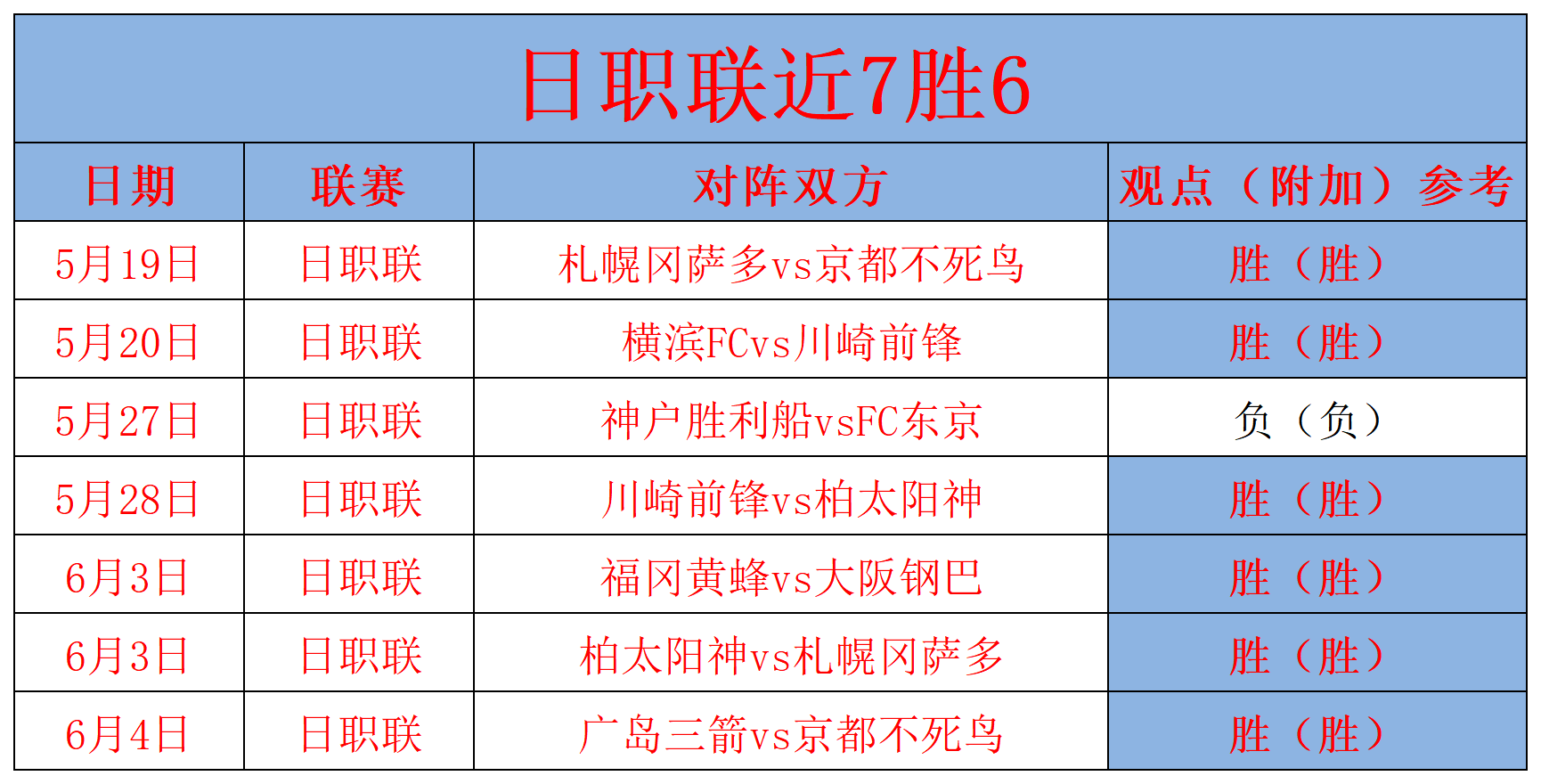 2、近期战绩回顾:昨天3场比赛已经拿下了2场,剩余一场美冠联仍在进行,近期整体成绩11胜9,目前5连胜,今天乘胜追击。今天早场先来一场日职联,对于日职联,笔者还是很有把握的,日职联近期的成绩也证明了笔者的分析能力到位,日职联近期成绩7胜6,目前4连胜,今天继续冲连胜。