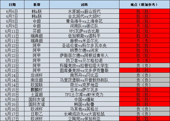 赛事回顾:上轮分享日职乙虽然遗憾失利,欧洲杯取得胜利,顺利拿下数据,双方以1-1握手言和。作者分析赛事数据正确,曾在6月6至13日取得10连胜的赛果,作者状态稳定,会不断重整赛事的分析和计算方向,提高方向正确率成绩。继续争取今日精选的全部赛事取胜。