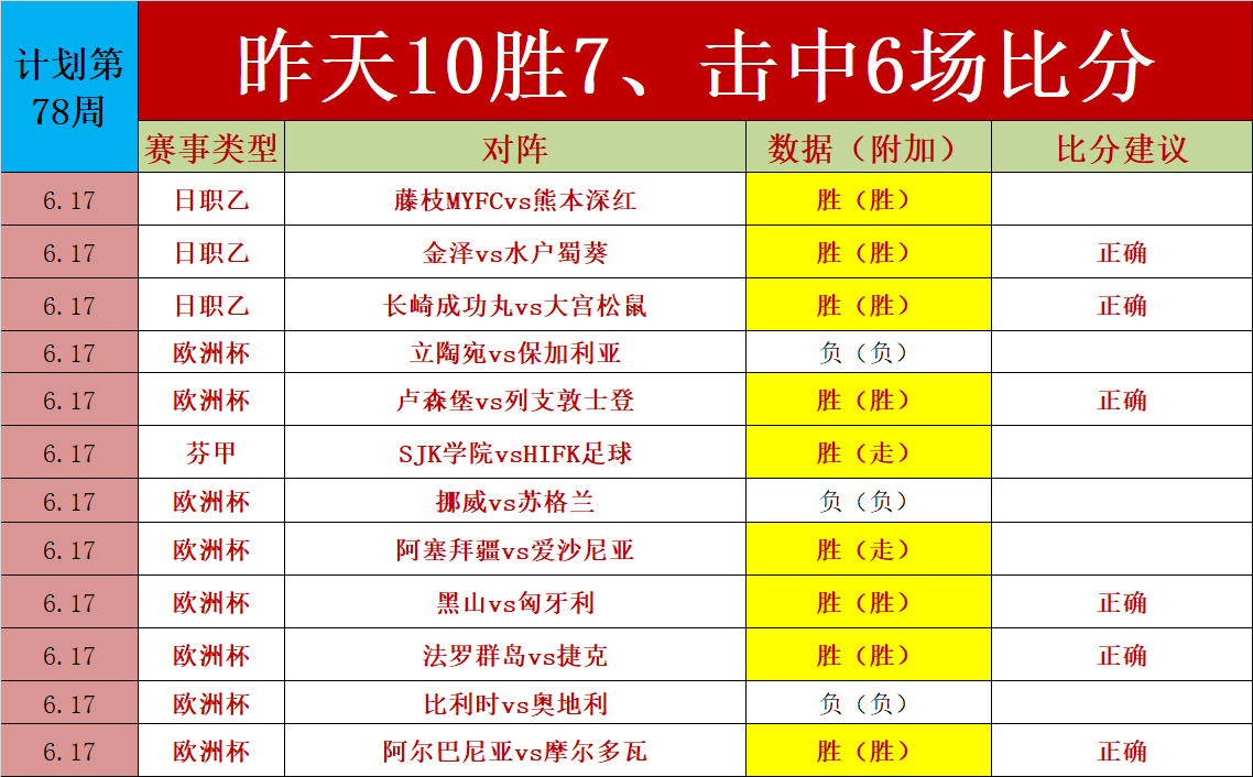 1、推演士计划第78周(走不纳入统计)昨天没有让大家失望,昨天状态炸裂,昨天12场比赛只有3场失手,有效战绩拿下10胜7,值得称赞的是昨天击中了6场比分,还有值得一提的是日职乙3场大获全胜,今天周日冲刺本周完美收收官。