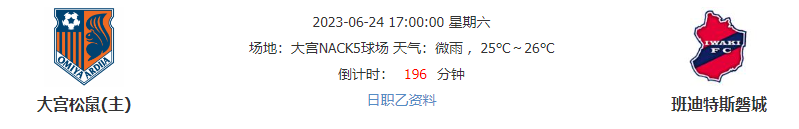北京时间06月24日17时00分,日本职业J2联赛迎来22轮赛事第4场较量:由大宫松鼠坐阵大宫NACK5球场迎战班迪特斯磐城,续写着13场不胜记录的大宫松鼠,能否凭主场之利,借升班马弱旅良机迎来久违的胜利。