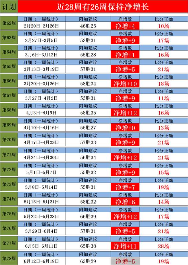 2、近28周有26周保持净增长,上周预测19场比分正确,持续的保持了高效的稳定。