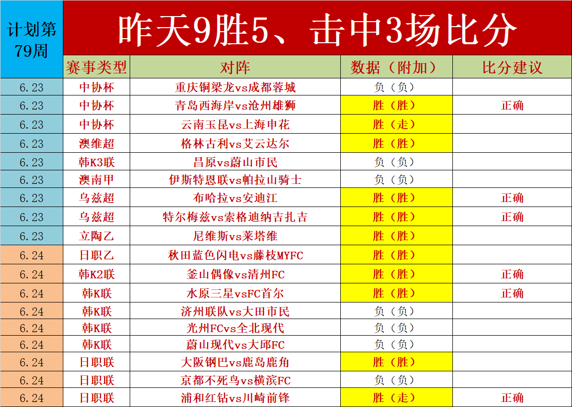 1、推演士计划第79周收官了(走不纳入统计)昨天状态炸裂,拿下观点9胜5的佳绩,连续两天净增长,昨天击中了3场比分,昨天的日希表现不俗,观点4胜3,今天还是日系和韩系为主,今天周日势必完美收官。
