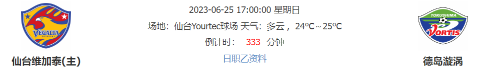 1、2023赛季日本职业联赛J2第22轮打响,仙台维加泰主场迎战德岛漩涡。日职乙联赛共22支球队,以主客场双循环作赛,联赛前2名直接升入日职联,3-6名参加升级附加赛,后2名直接降级。仙台维加泰2021赛季排名日职联倒数第2位,从而直接降入日职乙联赛;作为上赛季日职乙降班马,球队取得联赛第7的成绩,本赛季迄今球队表现也差不多,上轮联赛客场0-2不敌山口雷法,遭遇联赛2连败,目前8胜6平7负积30分排名日职乙第10位,球队攻防两端表现也都较为一般。