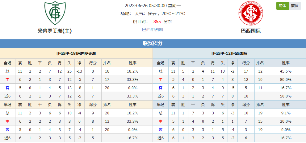 北京时间06月26日05:30,2023 巴西甲组联赛,米内罗美洲vs巴西国际,米内罗美洲近期状态普普通通,而相反巴西国际并没有受多线作战的影响,仍保持比较稳定的状态,今天米内罗美洲坐镇主场情况下能够取得一场胜利。