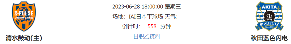 1、2023赛季日本职业联赛J2第21轮一场补赛打响,清水鼓动主场迎战秋田蓝色闪电。日职乙联赛共22支球队,以主客场双循环作赛,联赛前2名直接升入日职联,3-6名参加升级附加赛,后2名直接降级。清水鼓动上赛季排名日职联倒数第2位,从而直接降入日职乙;作为本赛季日职乙降班马,球队表现一般,上轮联赛客场1-1遇冷被群马草津温泉逼平,目前8胜8平5负积32分排名日职联第7位,球队攻防两端表现都十分出色,场均得1.9球更是联赛第一多。
