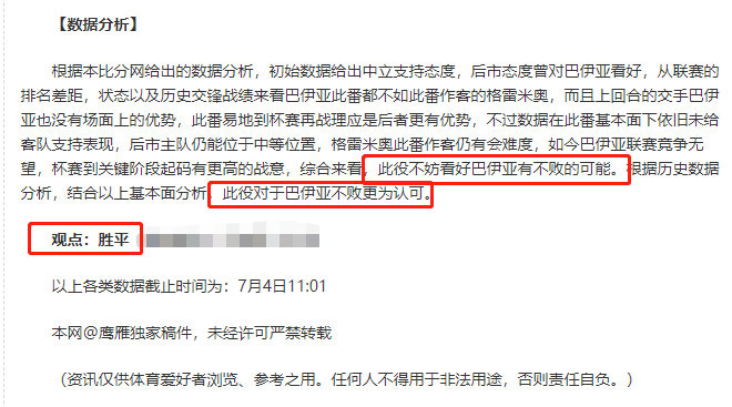 各位好,我是鹰雁,本人潜心研究数据走势变化及两队基本面之间的逻辑辩证关系,擅长结合热度走向分析足球,主攻数据,见解独特。作为15年的足球狂热分子,对足球历史数据,球队战术、状态及其心理素质综合面分析庖丁解牛,留下精华,希望能与各位共同分享足球带来的快乐!