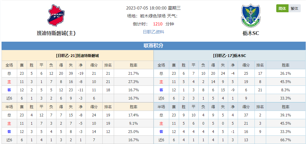班迪特斯磐城在日职乙本赛季23轮比赛成绩为5胜6平12负,球队处于联赛倒数,本赛季开局令人失望。目前总积分为21分,排在联赛的第21名。联赛总进球为20球,进攻端表现显得相当乏力,总失球为39球,他们的防守表现也是拖累了不少。上一役联赛班迪特斯磐城迎战秋田蓝色闪电,客场表现得相当坚韧,终使秋田蓝色闪电以1:1战平。班迪特斯磐城与枥木SC近1场交手的成绩是0胜0平1负,他们的历史往绩处于劣势。而双方上一次的交手班迪特斯磐城客场战败,此役主战能否完成复仇?