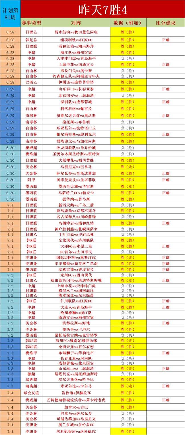 1、推演士计划第81周(走不纳入统计)昨天周二,保持高效的胜率,早上的美职联未结束,未纳入统计,昨天5胜3,早上赛事大获全胜,昨天继续有击中比分,重点美洲赛事又来了。