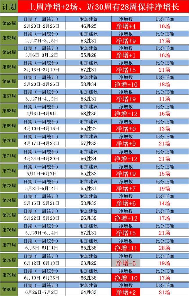 2、上周净增+2场,近29周有27周保持净增长,上周预测21场比分正确,持续的保持了高效的稳定。